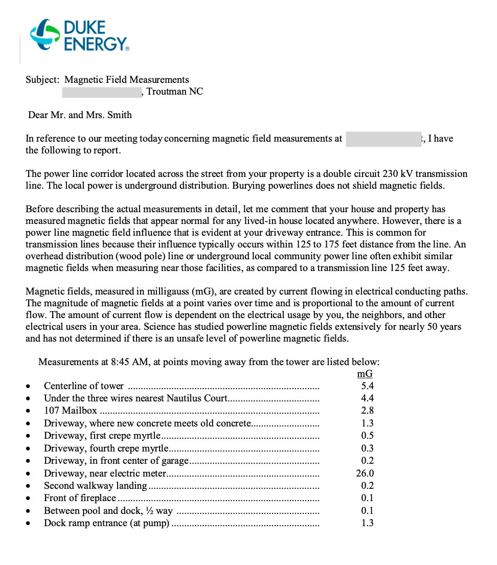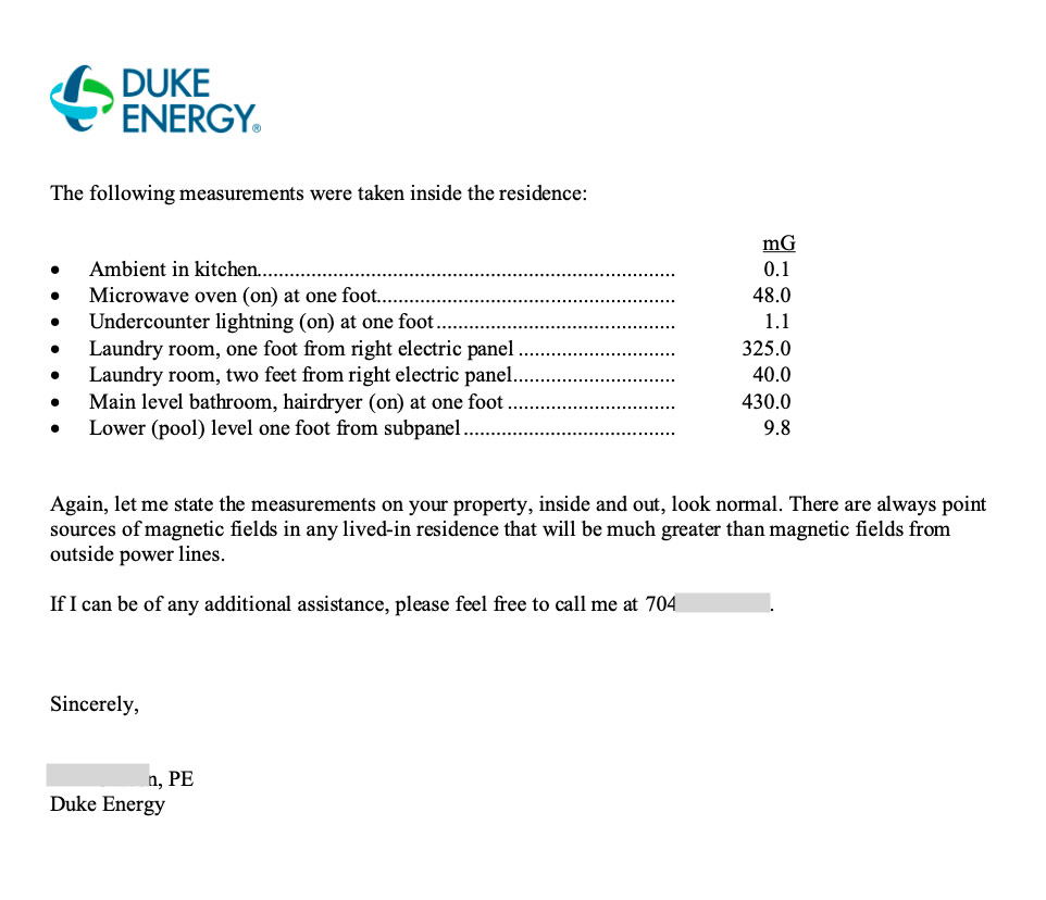 Below are the actual measurements provided by Duke Energy after testing directly beneath the transmission lines and inside the home located approximately 400 feet away. The lines run in front of the house.